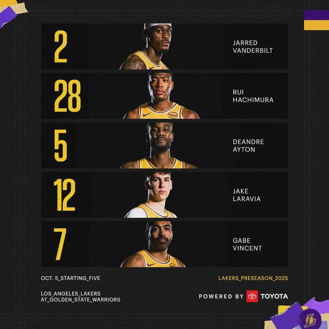湖人首发:文森特、拉拉维亚、范德比尔特、八村塁、艾顿。勇士首发:库里、波杰姆斯基、穆迪、巴特勒、追梦格林。老将霍福德今日替补出战,不过常规赛开始后,霍福德会打首发。梅尔顿还在养伤,他跟赛斯-库里今天不打。