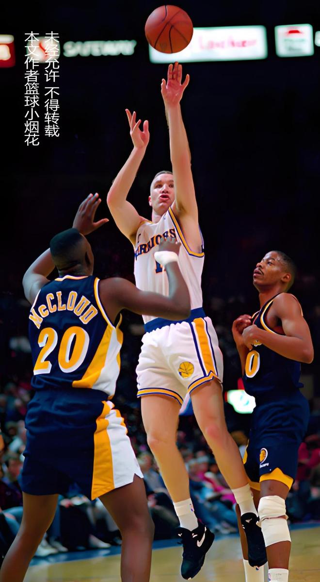 我认为,五小阵容的成功,并不是体系的成功,而单纯是三分球的成功,在老尼尔森的勇士时代,三分球虽然已经出现了,但并不是联盟主流,克里斯-穆林已经是那个时代最精英的外线射手了,但他巅峰期场均也就进不到1.5个三分球,也正是因为投的少,参考数值太小,所以命中率很不稳定,综合整个职业生涯三分球命中率在38%左右,如果以现在的视角来看,一名38%命中率场均进1.5个三分球,只能说是角色球员的水平。
